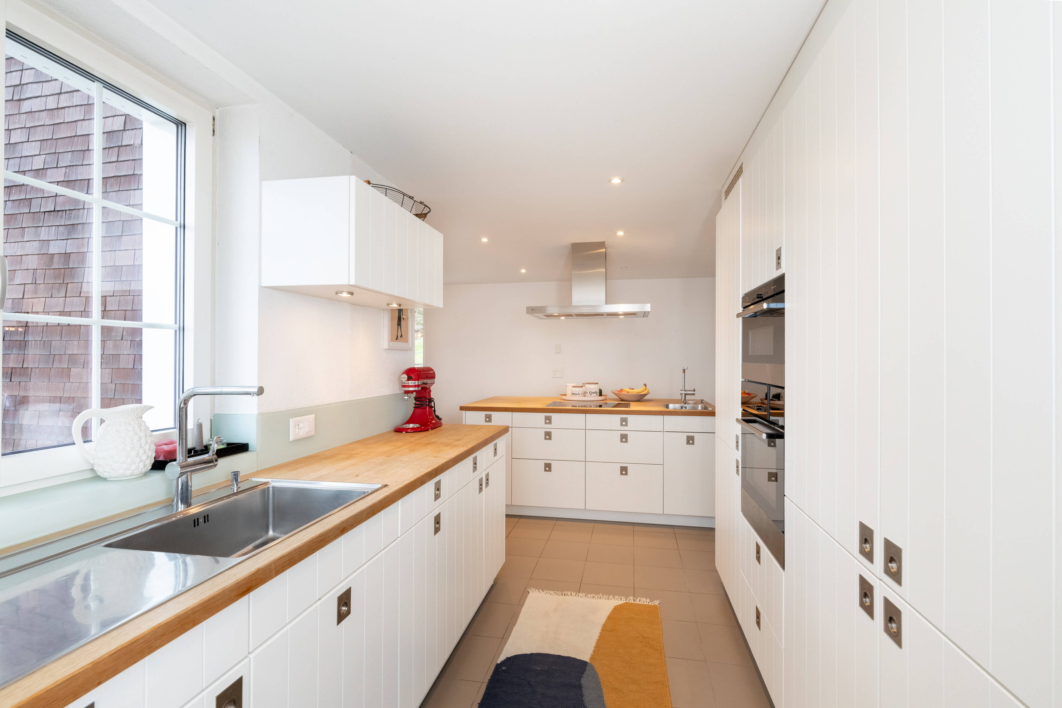 Vom überdachten Eingangsbereich mit angrenzendem Geräteraum aus, betreten Sie das Haus und werden sogleich von dessen wunderschönem Wohngefühl empfangen. Auf dieser Etage stehen Ihnen zwei grosse Kellerräume und die Waschküche, sowie der Technikraum zur Verfügung. Über das helle Treppenhaus gelangen Sie in den Wohnbereich. Die Aufteilung der Etage ist ideal. Die offene Küche mit Backofen und Steamer, viel Stauraum und zwei Lavabos - einmal auf der Kombination und einmal auf der Kochinsel neben dem Herd - bietet viel Platz. Der angrenzende Essbereich wird mit Sicherheit zu Ihrem neuen Lieblingsplatz. Durch die beiden Fenster geniessen Sie den Blick ins Grüne und den Wald. Der Wohnbereich ist aufgeteilt in einen Essbereich, welcher sehr viel Platz für einen grossen Esstisch bietet, sowie einen Bereich für gemütliche Stunden vor dem einzigartigen Kachelofen. Vom Wohnbereich aus haben Sie zudem Zugang zur Terrasse.